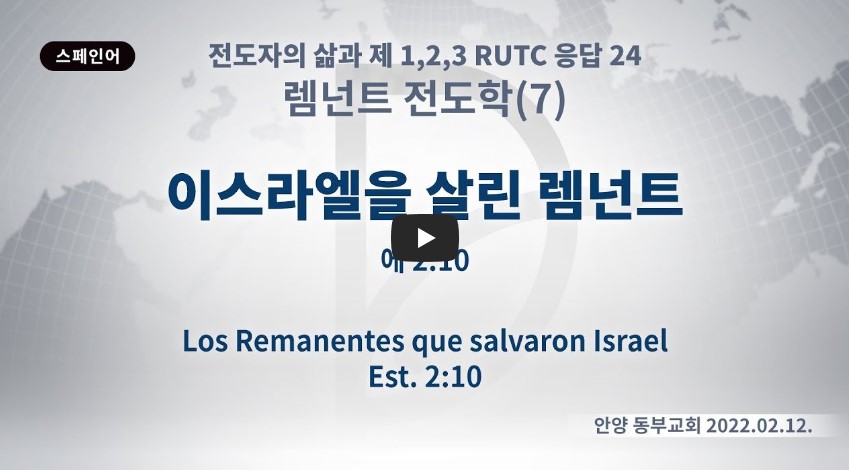 2022년 10월 11일(화) 분류 렘넌트전도학(2022-제123RUTC응답24)-07 제목 이스라엘을 살린 렘넌트 성경 에스더 2:10 일시/장소 2021년 2월 12일, 교회 설교 류광수 목사 (녹취정리: 차동호 목사) 출처 (사)세