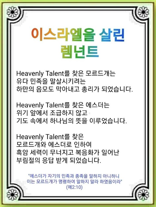 1. Heavenly Talent를 찾은 모르드개