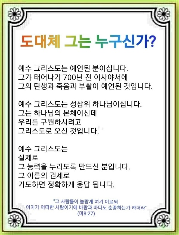 그리스도를 알고, 바라보고, 말할 때 모든 운명이 바뀌고, 응답의 문이 열리며, 전 세계가 바뀝니다. 예수님과 제자들이 바다를 건널 때 풍랑이 일어났습니다. 제자들이 불안에 떨며 주무시는 예수님을 깨워서 구원해 달라고 하자 예수께서 바람과 바다를 잠잠케 하셨습니다. 이를 본 사람들이 “이 사람이 누구냐?” 하며 놀랍게 여겼습니다. 우리도 그리스도를 모시고 있으면서 불안해합니다. ‘도대체 예수 그리스도, 그는 누구신가?’라는 인생의 질문을 해야 합니다.