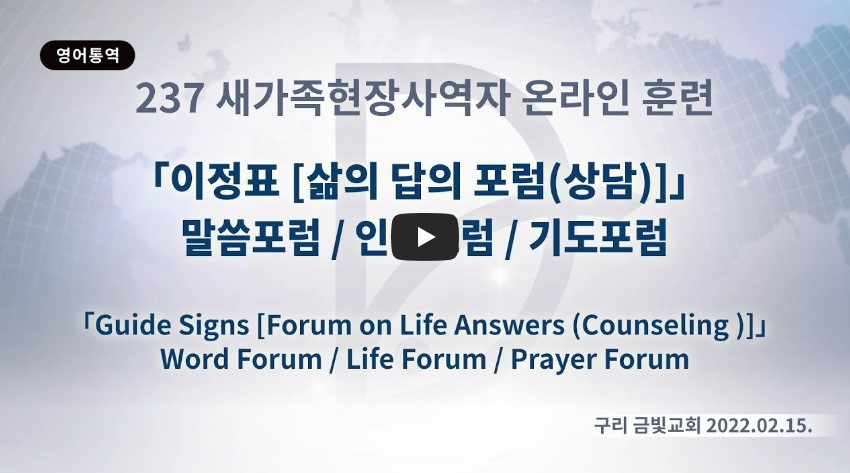 2022년 10월 20일(목) 분류 2022- 새가족/현장사역자 수련회 제목 3강: 이정표와 삶의 답에 대한 포럼- 기도 포럼 성경 사도행전 1:3 일시/장소 2022년 2월 15일, 금빛 교회(온라인) 설교 류광수 목사 (녹