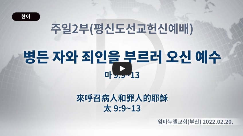 2022년 10월 28일 (금) 분류 주일예배 설교- 주일2부 제목 (평신도선교헌신) 병든 자와 죄인을 부르러 오신 예수 성경 마태복음 9:9-13 일시/장소 2022년 2월 20일, 임마누엘교회(부산) 설교 류광수 목