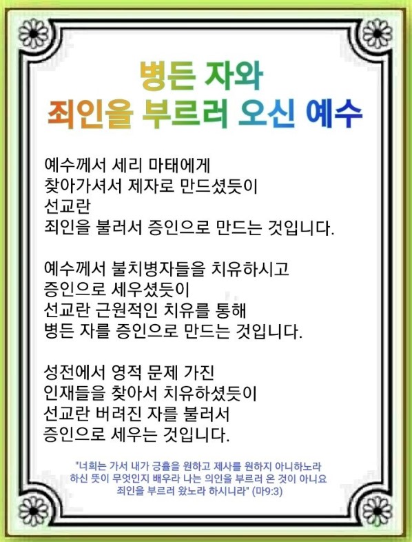 예수께서는 혈루증 환자, 중풍병자, 벙어리, 문둥병자, 귀신 들린 자들을 고치셨습니다. 병원에서 손댈 수 없는 사람들을 치유하시고 증인으로 세우신 것입니다. 우리에게도 귀신을 내쫓고 병을 고치는 권세를 주셨습니다.(마가복음 16:17-18)