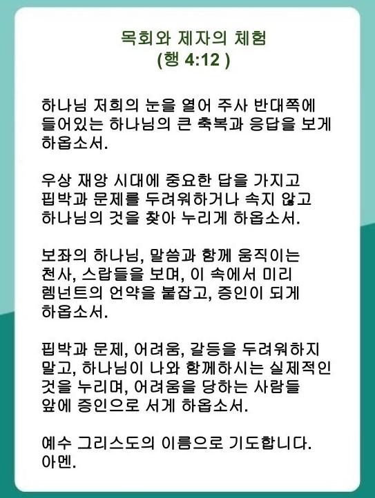 [언약 기도] 하나님께 감사드립니다. 저희의 눈을 열어 주사 반대쪽에 들어있는 하나님의 큰 축복과 응답을 보게 하옵소서. 핍박과 문제를 두려워하거나 속지 않고 하나님의 것을 찾아 누리게 하옵소서. 그리하여 어려움과 갈등 중에 있는 사람들 앞에 증인으로 서게 하옵소서. 예수 그리스도 이름으로 기도하옵나이다. 아멘.