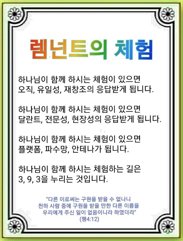 렘넌트는 하나님이 나와 함께하시는 체험이 있어야 합니다. 이것을 위해 렘넌트는 눈에 안 보이는 것을 먼저 알고 볼 줄 알아야 됩니다. 그것이 바로 3•9•3입니다. 지금도 성삼위 하나님이 나와 함께하시는 것과 보좌의 축복으로 함께 계시는 것이 보여야 합니다. 이때 렘넌트에게 반드시 하나님을 만나는 9가지 체험의 캠프가 일어납니다.