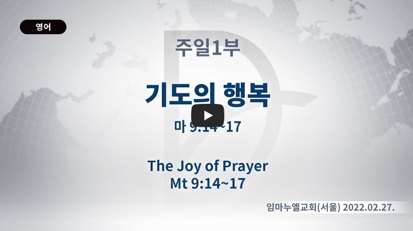 2022년 11월 11일(금) 분류 주일예배 설교- 주일1부 제목 기도의 행복 성경 마태복음 9:14-17 일시/장소 2022년 2월 27일, 임마누엘교회(서울) 설교 류광수 목사 (녹취정리: 차동호 목사) 출처 (사) 세계