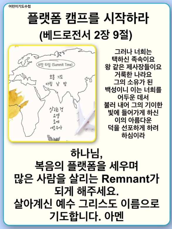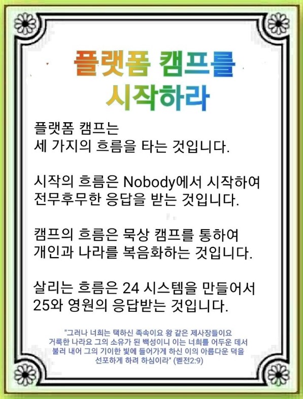 교회 부흥과 자신의 업에서 어려움을 겪는 사람이 많습니다. 특히 복음 운동이 잘 안 되는데 어떻게 하면 복음 운동을 잘 할 수 있을까요? 플랫폼을 만들면 됩니다. 먼저 플랫폼 캠프부터 시작하면 됩니다. 예수께서 참 왕, 참 제사장, 참 선지자이시기 때문에 우리에게 이 직분을 주셨습니다.(베드로전서 2:9) 사탄과 귀신에 잡힌 자, 재앙과 질병, 흑암 가운데 빠진 자가 더 많아질 것인데 이것이 플랫폼입니다. 이들에게 빛을 전하는 자로 우리를 부르셨는데 이것이 플랫폼 캠프입니다. 렘넌트 7명에게는 세 가지 플랫폼의 흐름이 있었습니다.