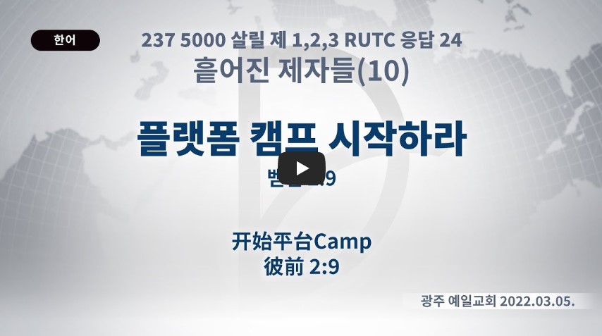 2022년 11월 17일(목) 분류 흩어진 제자들(2022-제123RUTC응답24)-10 제목 플랫폼 캠프를 시작하라 성경 베드로전서 2:9 일시/장소 2022년 3월 5일, 광주 예일교회 설교 류광수 목사 (녹취정리: 차동호 목