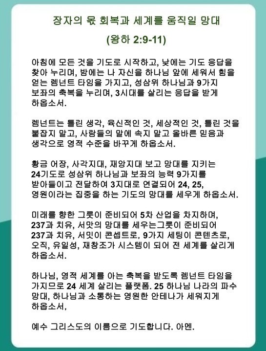 [언약 기도] 하나님, 모든 렘넌트들을 축복하시니 감사드립니다. 영적 세계를 아는 축복을 주옵소서. 렘넌트 타임을 가지므로 24 세계 살리는 플랫폼, 25 하나님 나라의 파수 망대, 하나님과 소통하는 영원한 안테나가 세워지게 하옵소서. 예수 그리스도 이름으로 기도하옵나이다. 아멘.