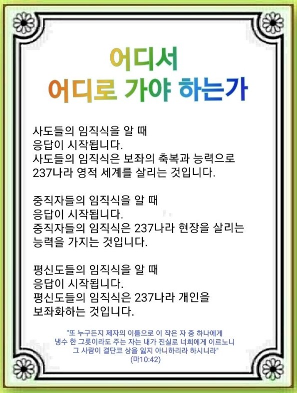 237나라 개인을 보좌화하는 것이 평신도의 전도입니다. 갈보리산 언약을 본 사람들이 감람산에서 하나님 나라의 일을 40일 동안 듣고 파송되었습니다. 그 언약을 잡고 마가 다락방에서 기도했습니다. 그때 바람, 불같은 능력이 나타났고 장래 일과 미래를 보고 꿈을 꾸었습니다.