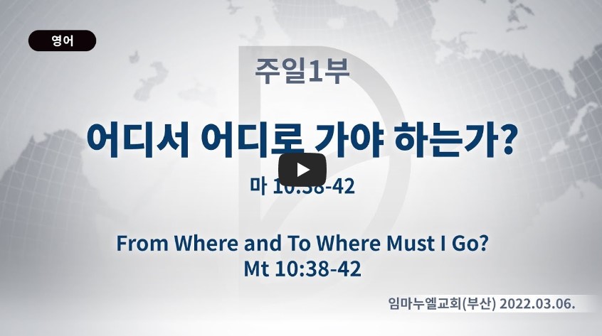 2022년 11월 23일(수) 분류 주일예배 설교- 주일1부 제목 어디서 어디로 가야 하는가? 성경 마태복음 10:38-42 일시/장소 2022년 3월 6일, 임마누엘교회(부산) 설교 류광수 목사 (녹취정리: 차동호 목사)