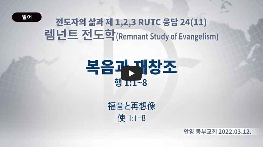 2022년 11월 26일(토) 분류 렘넌트전도학(2022-제123RUTC응답24)- 11 제목 복음과 재창조 성경 사도행전 1:1-8 일시/장소 2021년 3월 12일, 안양 도부교회 설교 류광수 목사 (녹취정리: 차동호 목사) 출처 (