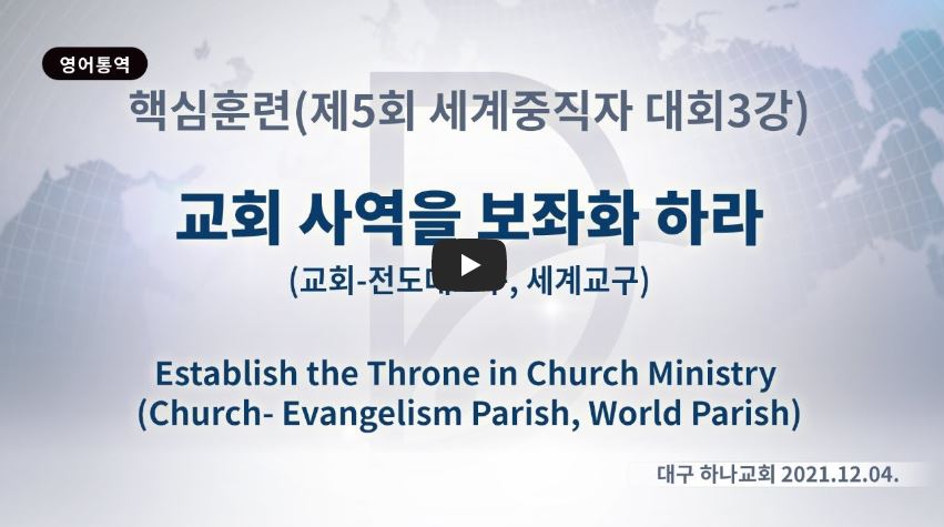2022년 11월 30일(수) 분류 2021- 제5회 세계 중직자대회 제목 3강: 중직자의 제3시대→ 교회 사역을 보좌화 (전도대교구, 세계교구) 성경 일시/장소 2021년 12월 3일-4일, 대구 하나교회 설교 류광수 목