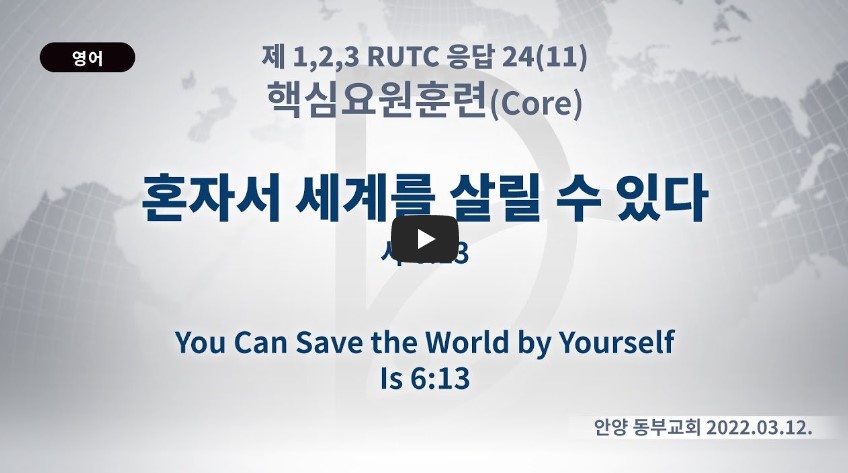2022년 12월 1일(목) 분류 핵심훈련(2022-제123RUTC응답24)- 11 제목 혼자서 세계를 살릴 수 있다 성경 이사야 6:13 일시/장소 2022년 3월 12일, 안양 동부교회 설교 류광수 목사 (녹취정리: 차동호 목사) 출