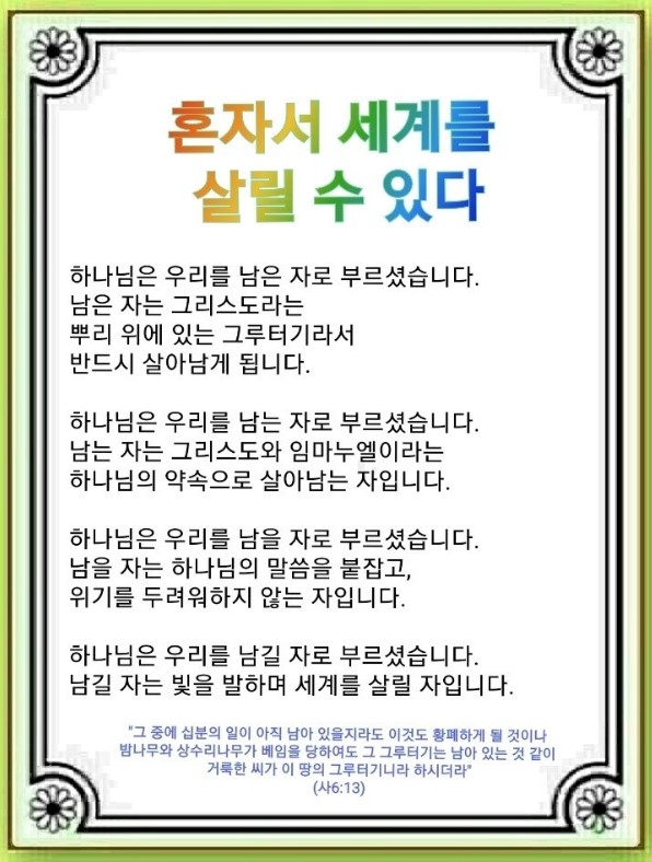 우리는 빛을 발하는 남길 자입니다. 이 빛을 보고 원방에서 렘넌트가 돌아오게 될 것입니다. 또, 우리는 종일 종야 쉬지 않고 여호와의 언약을 누리며, 만민을 위해서 기를 드는 파수꾼입니다. 그래서 세계 살릴 남길 자입니다.