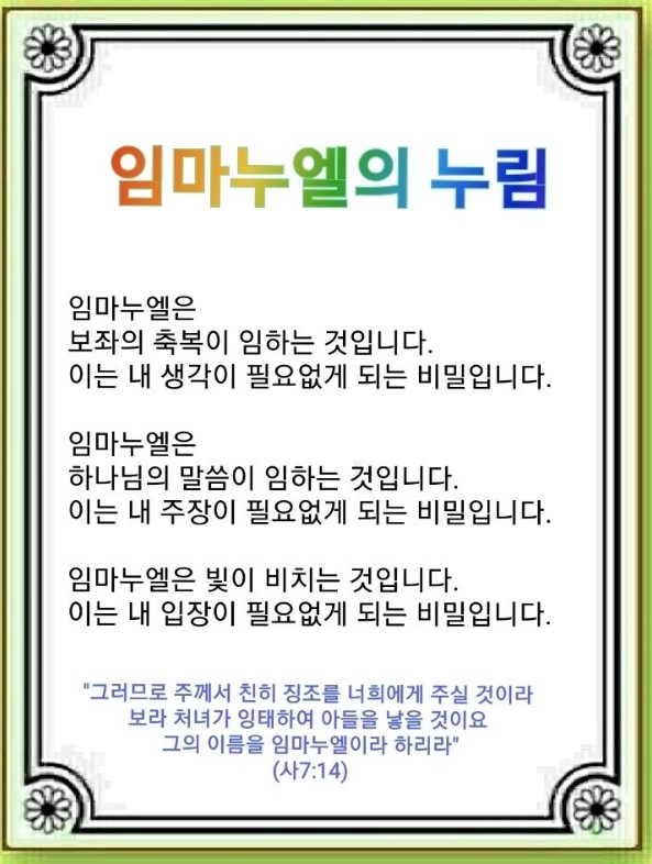 임마누엘은 빛이 비치는 것입니다. 그래서 하나님은 일어나 빛을 발하라고 하셨고 파수 망대를 만들어 빛을 밝히게 하셨습니다. 흑암은 빛을 이길 수 없습니다. 진짜 복음이라면 흑암은 꺾입니다.