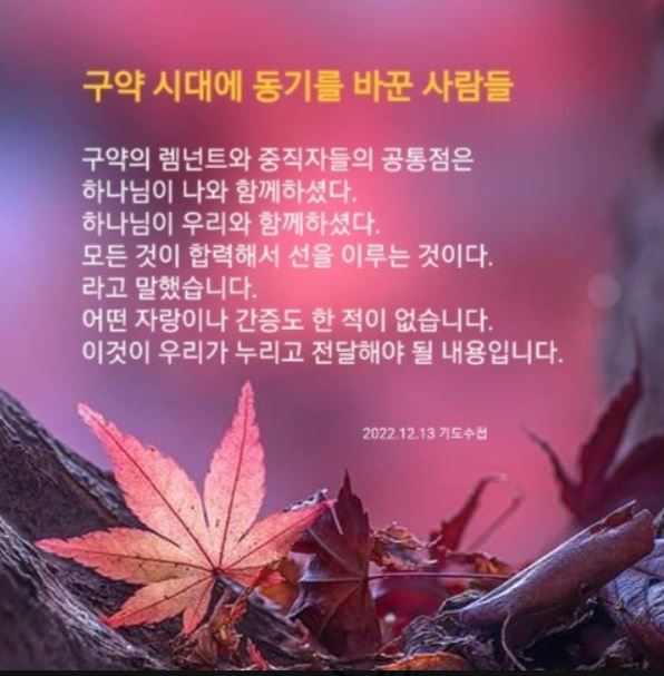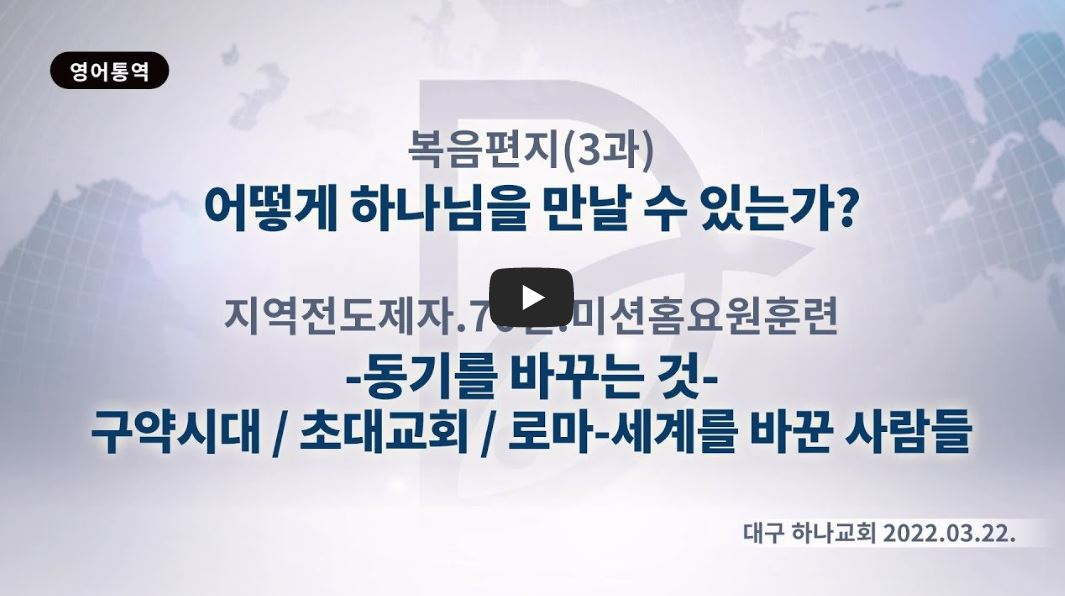 2022년 12월 13일 (화) 분류 2022- 237화요제자훈련(교재01-복음편지03) 제목 1강: 구약 시대에 동기를 바꾼 사람들 성경 일시/장소 2022년 3월 22일, 대구 하나교회(온라인) 설교 류광수 목사 (녹취정리: