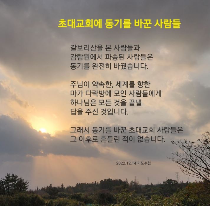 갈보리산을 본 사람들과 감람원에서 파송된 사람들은 동기를 완전히 바꿨습니다. 주님이 약속한, 세계를 향한 마가 다락방에 모인 사람들에게 하나님은 모든 것을 끝낼 답을 주신 것입니다. 그래서 동기를 바꾼 초대교회 사람들은 그 이후로 흔들린 적이 없습니다.
