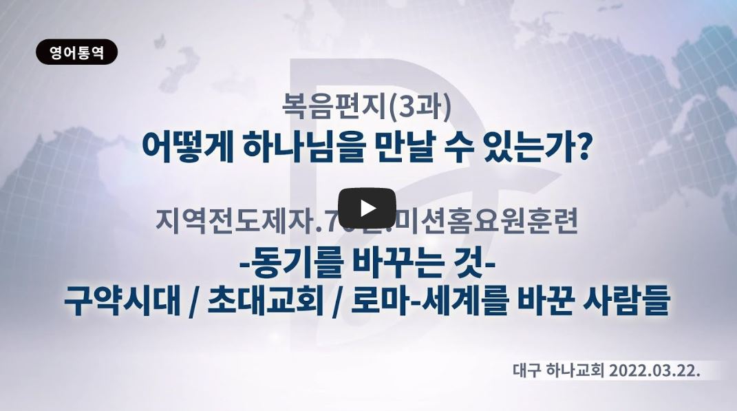 2022년 12월 14일 (수) 분류 2022- 237화요제자훈련(교재01-복음편지03) 제목 2강: 초대교회에 동기를 바꾼 사람들 성경 일시/장소 2022년 3월 22일, 대구 하나교회(온라인) 설교 류광수 목사 (녹취정리: