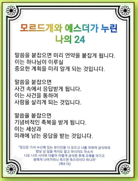 모르드개와 에스더가 누린 나의 24-몬테소리 치유센터