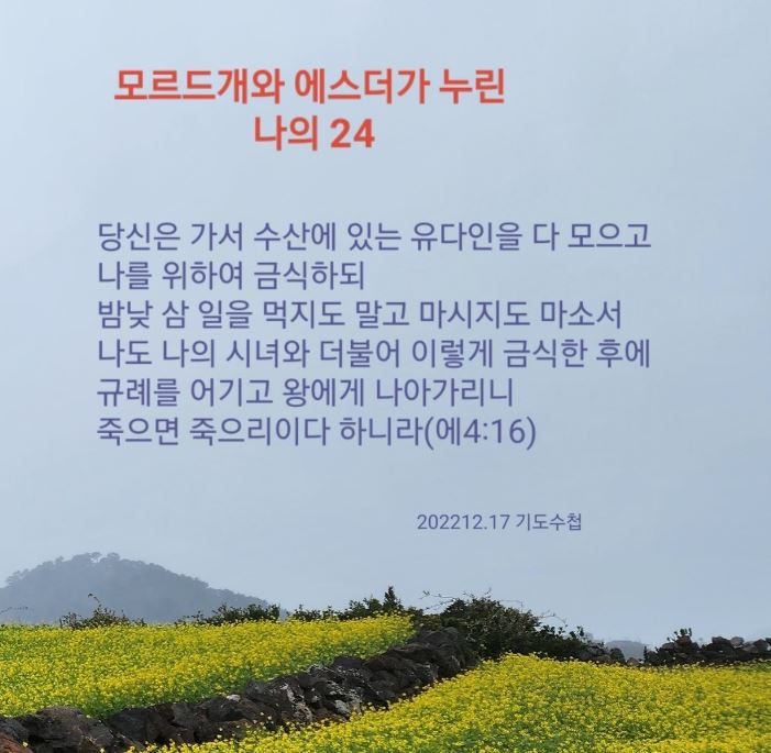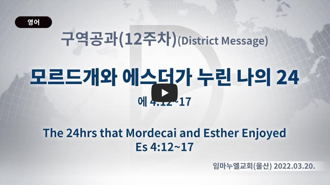 2022년 12월 16일 (금) 분류 구역공과- 2022년 12과 제목 모르드개와 에스더가 누린 나의 24 성경 에스더 4:12-17 일시/장소 2022년 3월 20일, 임마누엘교회(부산) 설교 류광수 목사 (녹취정리: 차동호 목사