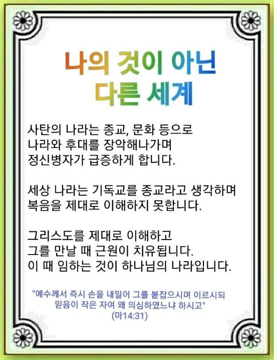 우리는 항상 현실에 속습니다. 현실 속에서 영적인 것을 보면 제대로 여유 있게 올바른 도전을 하게 됩니다.
