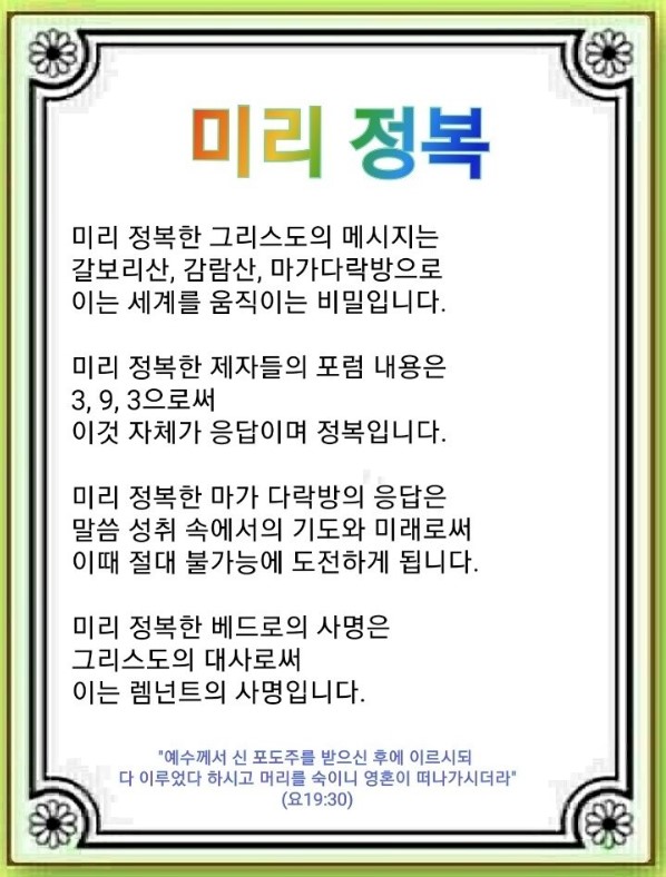 렘넌트들이 반드시 포럼 해야 할 것이 있습니다. 갈보리산 부활 메시지와 감람산 하나님 나라를 어떻게 누릴 것인지 포럼을 통해서 각인시키면 됩니다. 그리고 마가 다락방 집중 기도를 포럼 하면서 나의 기도 집중을 찾으면 됩니다. 그러면 반드시 세계를 움직일 수 있습니다.