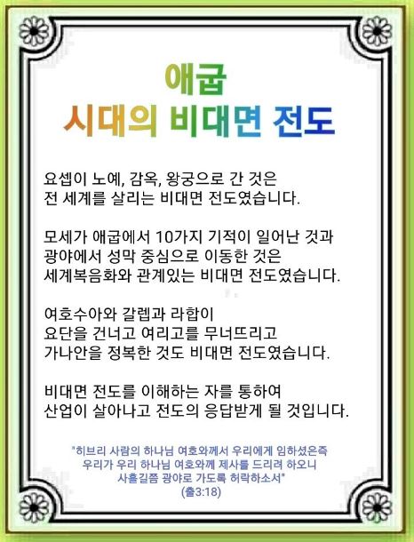 하나님이 전도하시는 숨은 방법 중의 하나가 비대면 전도입니다. 비대면 전도에는 세 가지 이유가 있습니다. 첫째, 하나님은 “모든 열방이 네 씨로 말미암아 복을 얻을 것이다.”라고 말씀하셨습니다. 비대면이라야 237이 가능합니다. 둘째, 앞으로 살아남는 산업은 비대면 산업입니다. 4차 산업은 비대면 산업이라고 보면 됩니다. 셋째, 비대면 산업과 비대면 전략은 원래 있었습니다. 그런데 미래에는 더 확실해집니다. 그렇다면 애굽 시대에는 비대면 전도를 어떻게 했을까요?