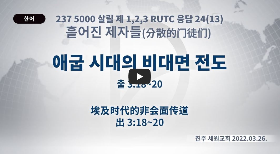 2022년 12월 23일 (금) 분류 흩어진 제자들(2022-제123RUTC응답24)-13 제목 애굽 시대의 비대면 전도 성경 출애굽기 3:18-20 일시/장소 2022년 3월 26일, 진주 세원교회 설교 류광수 목사 (녹취정리: 차동호