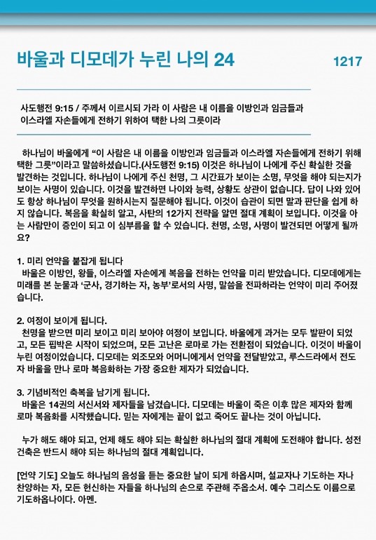 2022년 12월 24일 (토) 분류 구역공과- 2022년 13과 제목 바울과 디모데가 누린 나의 24 성경 사도행전 9;15, 로마서 16:25-27 일시/장소 2022년 3월 27일, 임마누엘교회(부산) 설교 류광수 목사 (녹취정리: