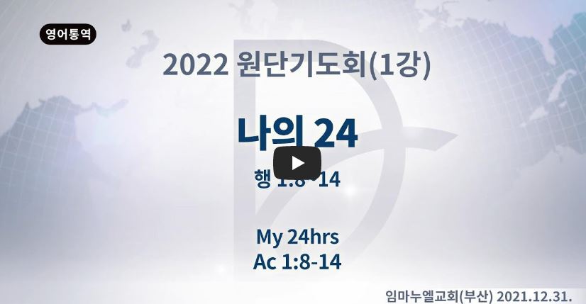 2022년 12월 28일 (수) 분류 2022- 원단기도회 (제123RUTC응답24) 제목 1강: 나의 24→ “보좌의 축복(393)이 내 안에” 성경 사도행전 1:8-14 일시/장소 2021년 12월 31일, 임마누엘(부산-온라인) 설교 류광수