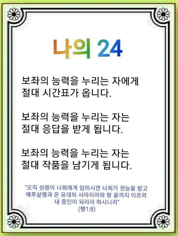 90% 사람이 ‘나’를 놓쳤고, 나를 발견하되 스스로 발견했기 때문에 어느 날 한계가 옵니다. 이것을 이용해서 3단체가 창세기 3장, 6장, 11장을 심었습니다. 하나님이 만드신 나를 찾아야 합니다. 하나님의 보좌가 내 안에 임하고(갈라디아서 2:20, 고린도전서 3:16, 고린도후서 5:17) 성삼위 하나님이 5력과 9보좌의 능력, 3시대의 축복으로 온 것입니다. 이것이 나의 24입니다. 내게 임한 보좌의 능력을 누리는 자는 문제가 오면 하나님의 답을, 갈등이 오면 하나님의 갱신을, 위기를 만나면 하나님의 기회를 찾아냅니다. 이때 몇 가지 응답이 옵니다.