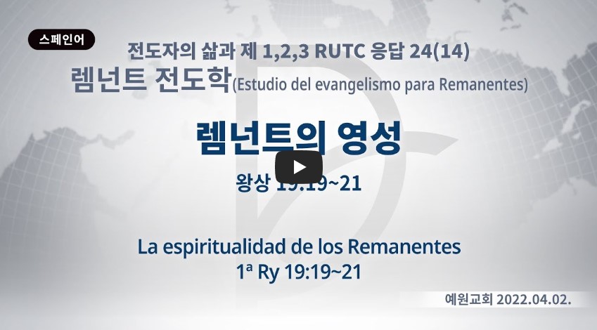 2023년 1월 2일 (월) 분류 렘넌트전도학(2022-제123RUTC응답24)- 14 제목 렘넌트의 영성 성경 열왕기상 19:19-21 일시/장소 2022년 4월 2일, 예원교회(온라인) 설교 류광수 목사 (녹취정리: 차동호 목사) 출