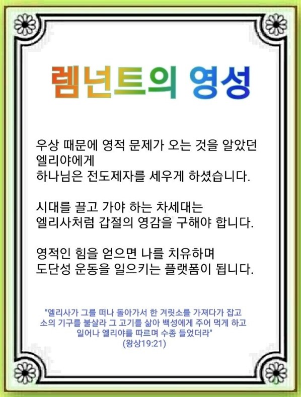 엘리사는 앞선 엘리야 시대가 마감되고, 차세대가 시대를 끌고 가야 된다는 것을 알았습니다.(왕하 2:1) 다른 생도들은 이 사실을 잘 몰랐습니다. 그래서 엘리야를 끝까지 따라가는 그를 이해하지 못했습니다.(왕하 2:2-8) 그는 엘리야를 끝까지 따라가서 갑절의 영감을 구했습니다. 이것이 렘넌트들이 해야 될 차세대 준비입니다.(왕하 2:9-11)