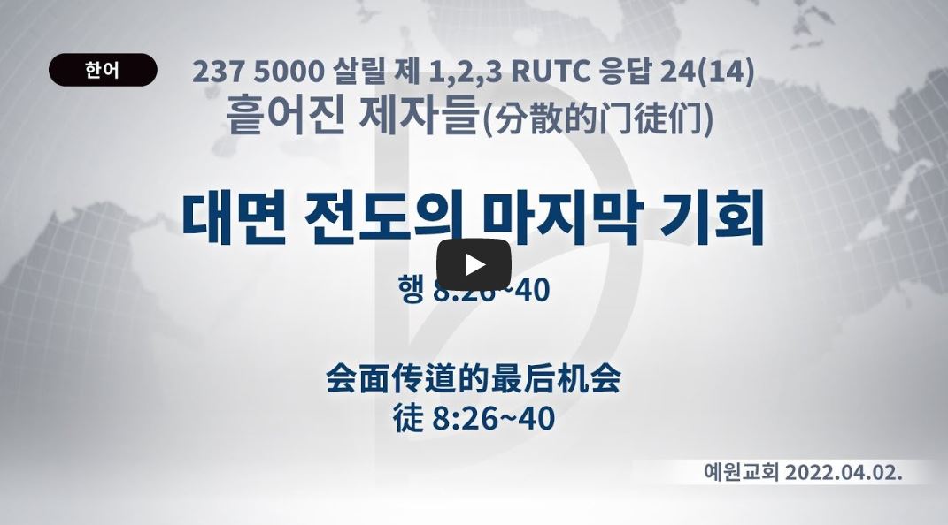 2023년 1월 4일 (수) 분류 흩어진 제자들(2022-제123RUTC응답24)- 14 제목 대면 전도의 마지막 기회 성경 사도행전 8:26-40 일시/장소 2022년 4월 3일, 예원교회(온라인) 설교 류광수 목사 (녹취정리: 차동호