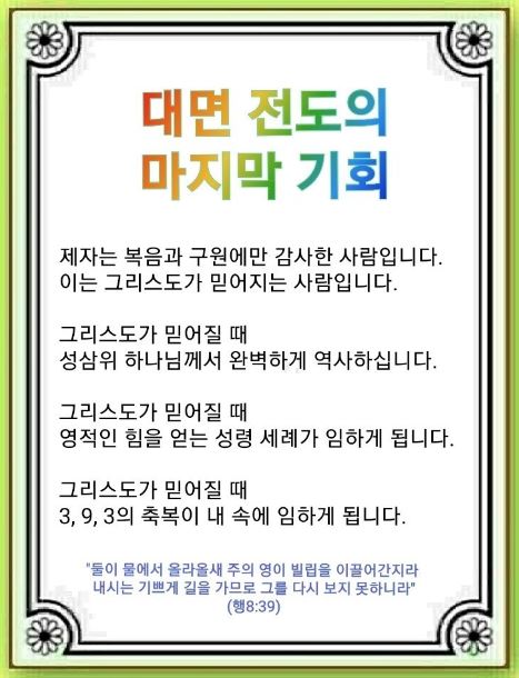 만나는 사람이 3•9•3을 놓고 기도할 수 있도록 만들어야 주어야 됩니다. 성삼위 하나님과 보좌의 축복 9가지, 3시대가 내 속에 임하는 것입니다. ‘이렇게 기도하면 되겠구나!’라는 기도의 확신이 있어야 됩니다. 이 기도를 할 줄 모르면 모든 것을 받아놓고도 확신이 없게 됩니다.