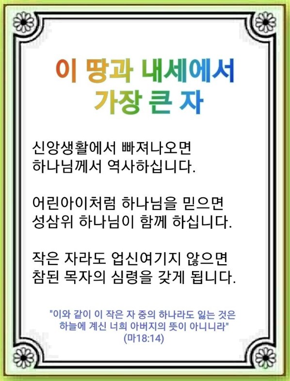 진짜 하나님을 믿고 그 능력을 정말 안다면 작은 자라도 업신여기지 않습니다. 오히려 백 마리 양 중에 잃어버린 양 한 마리를 찾아서 기뻐하는 목자와 같은 심령을 가집니다. 이 말을 알아들은 마가 다락방의 제자 120명이 세계를 정복했습니다.