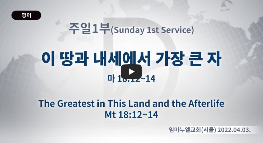 2023년 1월 6일 (금) 분류 주일예배 설교- 주일1부 제목 이 땅과 내세에서 가장 큰 자 성경 마태복음 18:12-14 일시/장소 2022년 4월 3일, 임마누엘교회(서울) 설교 류광수 목사 (녹취정리: 차동호 목사)
