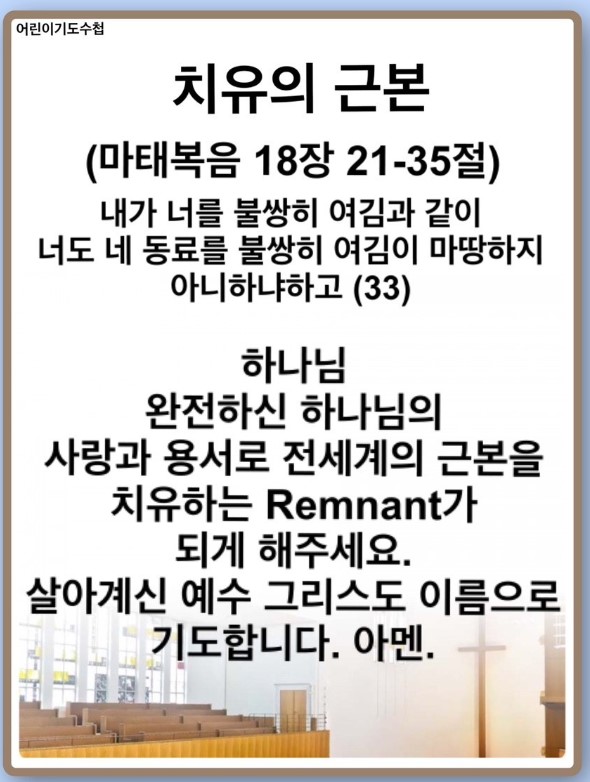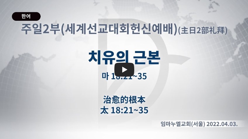 2023년 1월 7일 (토) 분류 주일예배 설교- 주일2부 제목 (세계선교대회헌신예배) 치유의 근본 성경 마태복음 18:21-35 일시/장소 2022년 4월 3일, 임마누엘교회(서울) 설교 류광수 목사 (녹취정리: 차동