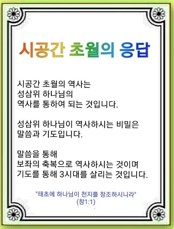 시공간 초월의 응답이 없으면 세계복음화를 할 수 없습니다. 쉽게 말하면 시공간 초월의 전쟁입니다. 우리는 이것을 영적 전쟁에서 강대국에게 빼앗겼습니다. 강대국은 노예제도로 237을 장악했습니다. 3단체는 기운동을 통해 시공간 초월로 들어가고 있고, 5천 종족은 주술로 영적 소통을 하고 있습니다. 그래서 하나님은 시공간 초월하는 답과 힘을 가진 렘넌트 7명과 소수의 산업인, 중직자들을 통해 세계를 뒤흔들었습니다. 시공간 초월을 실제로 누리는 것이 기도입니다. 그렇다면 어떤 말씀을 가지고 시공간 초월의 축복을 누릴 수 있을까요?