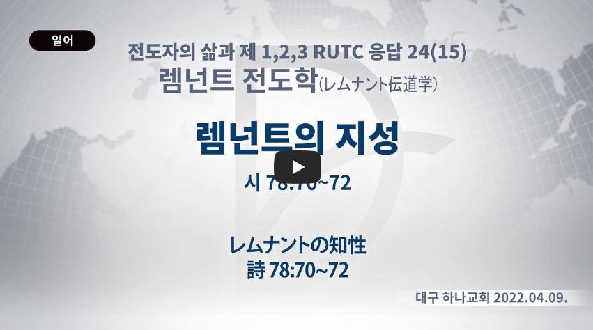 2023년 1월 10일(화) 분류 렘넌트전도학(2022-제123RUTC응답24)- 15 제목 렘넌트의 지성 성경 시편 78:70-72 일시/장소 2022년 4월 9일, 대구 하나교회 설교 류광수 목사 (녹취정리: 차동호 목사) 출처 (사)세