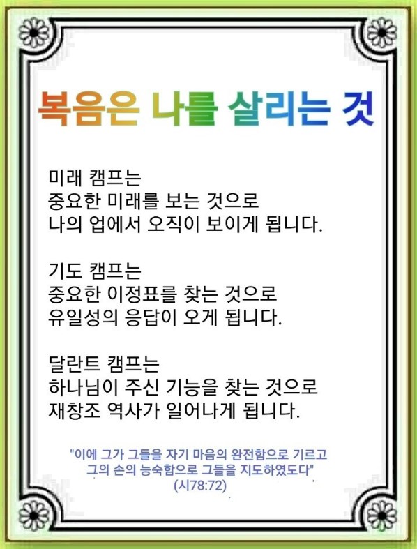 중요한 마지막 준비를 해야 합니다. 먼저 5분만 복음으로 나를 살리면 됩니다. 이것이 발전되어 9가지 여정이 됩니다. 5분만 묵상해도 내 영이 살아나는데, 이때 창조의 빛과(창 1:3) 하나님의 형상과(창 1:27) 하나님의 생기가(창 2:7) 들어옵니다. 특히 기도하면서 깊은 호흡을 하면 뇌를 살리게 되고 내 몸도 살아납니다. 중요한 것은 리듬을 살려내는 것입니다. 순간순간 운동도 하고 좋은 음식도 먹으면 평생 건강해집니다. 이러면 영적 상태가 달라집니다. 문제, 갈등, 위기가 오면 평생을 놓고 오늘을 보게 됩니다. 그러면 이것이 내게 필요한 것이라는 답이 나오고 내가 새롭게 되는 기회가 됩니다. 평안과 감사, 능력이 생깁니다. 이때 영적 서밋이 됩니다. 먼저 세 가지 여정을(3 캠프) 찾고 그릇 준비를 해야 합니다.