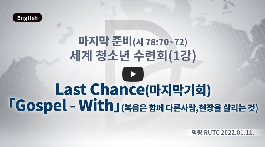 2023년 1월 13일(금) 분류 2022- 세계청소년수련회 제목 1강: Last chance: “Gospel- WITH” 성경 일시/장소 2022년 1월 12일, 덕평RUTC교회(온라인) 설교 류광수 목사 (녹취정리: 차동호 목사) 출처 (사) 세계