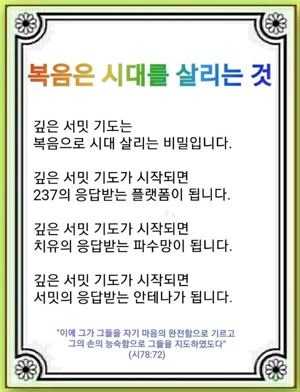 그리스도는 생명입니다. 다윗은 나와 다른 사람, 시대를 살리는 복음을 붙잡았습니다. 그는 아무도 관심 없는 오직 교회와 성전이 무엇인지 알았습니다.(대상 29:10-14) 이제 나의 영을 살리는 기도를 해야 합니다. 반드시 이 기도는 현장으로 연결됩니다. 그래서 아침과 밤에 항상 하나님과 함께하는 깊은 서밋 기도가(시 5:3, 17:3, 23:1) 시작되어야 합니다. 보좌의 주인인 성삼위 하나님과 보좌의 내용 9가지, 보좌의 목표인 3시대를 누리면 됩니다. 다윗은 어렸을 때 하나님을 알고(시 78:70-72), 소년 시절에 골리앗을 만났습니다.(삼상 17:1-47) 청년 때는 여호와가 나의 목자이시기 때문에 두렵지 않다고 고백했습니다.(시 23:1-6) 임금 자리에서 오직 여호와의 전을 생각했습니다.(대상 29:10-14) 노년에는 시므이의 저주를 하나님이 시켜서 한 것이라고 했습니다.(삼하 16:5-23) 깊은 서밋 기도가 시작될 때 9가지 여정 중 마지막 세 가지 여정을 가게 됩니다.