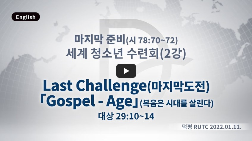 2023년 1월 14일(토) 분류 2022- 세계청소년수련회 제목 2강: Last challenge→ “Gospel- Age” 성경 역대상 29:10-14 일시/장소 2022년 1월 12일, 덕평RUTC(온라인) 설교 류광수 목사 (녹취정리: 차동호 목사) 출