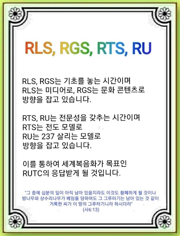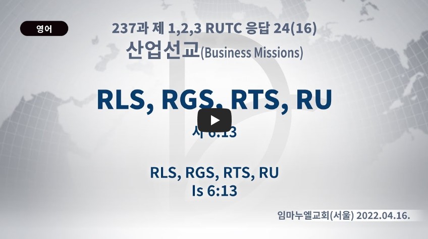 2023년 1월 25일 (수) 분류 산업선교(2022-제123RUTC응답24)- 16 제목 RLS, RGS, RTS, RU 성경 이사야 6:13 일시/장소 2022년 4월 16일, 임마누엘서울교회 설교 류광수 목사 (녹취정리: 차동호 목사) 출처 (사)세