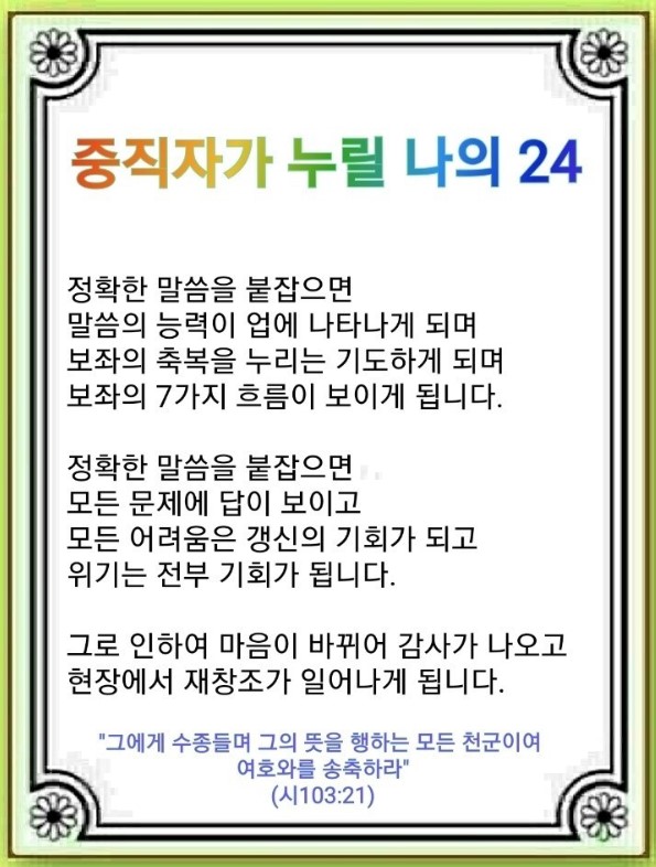 중직자의 24는 정확한 말씀을 붙잡는 것입니다. 그 안에 하나님의 뜻이 들어 있기 때문입니다. 로마의 속국 된 이스라엘에게 예수께서는 그들이 말하는 복은 복이 아니라고 하셨습니다. 코로나와 4차 산업 시대에 영적 문제가 더 많아졌습니다. 우리 앞에는 축복과 저주가 늘 있기 때문에 말씀을 정확하게 붙잡는 것이 가장 중요합니다. 237시대의 플랫폼인 성전을 통하여 치유, 서밋, 렘넌트운동을 해야 합니다. 하나님 말씀을 정확하게 붙잡고 예배할 때 천사를 보내사 말씀을 이루고 천군을 보내어 하나님의 뜻을 행한다고 하셨습니다.(시 103:20-22) “하나님이 임재하는 곳에 있는 너희여”라고 기도 응답을 가장 많이 받은 다윗이 고백했습니다. 여기서 너희는 천군, 천사를 말합니다. 정확한 언약이 붙잡아지면 여정은 저절로 나옵니다. 여정에는 목표가 있습니다. 하나님의 말씀은 반드시 성취되기 때문입니다. 이렇게 되면 5가지가 바뀝니다.