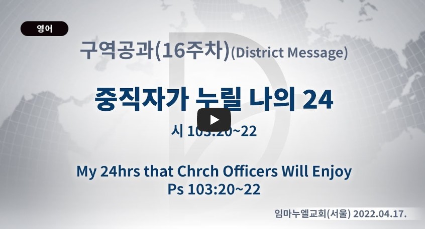 2023년 1월 30일 (월) 분류 구역공과- 2022년 16과 제목 중직자가 누릴 나의 24 성경 시편 103:20-22 일시/장소 2022년 4월 17일, 임마누엘교회(서울) 설교 류광수 목사 (녹취정리: 차동호 목사) 출처 (사)세