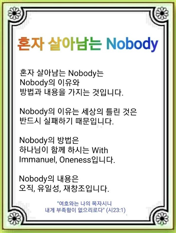 Nobody의 방법은 무엇일까요? 하나님이 나와 함께하시는 With, 우리와 함께하시는 Immanuel, 모든 것에 함께하시는 Oneness입니다.