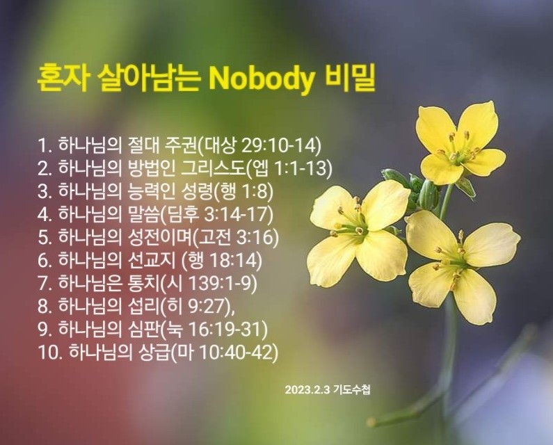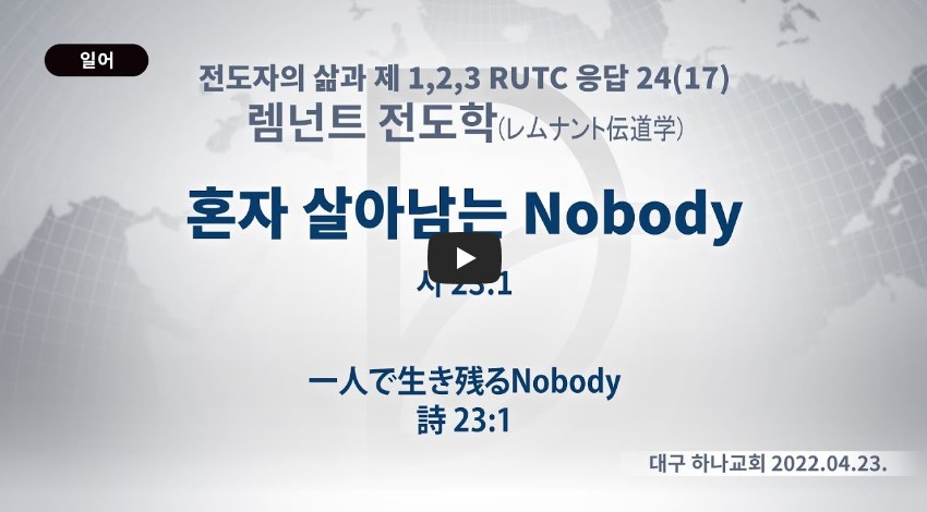 2023년 2월 3일(금) 분류 렘넌트전도학(2022-제123RUTC응답24)- 17 제목 혼자 살아남는 Nobody 성경 시편 23:1 일시/장소 2022년 4월 23일, 대구 하나교회 설교 류광수 목사 (녹취정리: 차동호 목사) 출처 (사)