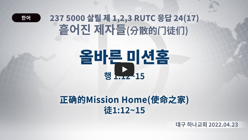 2023년 2월 6일 (월) 분류 흩어진 제자들(2022-제123RUTC응답24)- 17 제목 올바른 미션홈 성경 사도행전 1:12-15 일시/장소 2022년 4월 23일, 대구 하나교회 설교 류광수 목사 (녹취정리: 차동호 목사) 출처 (